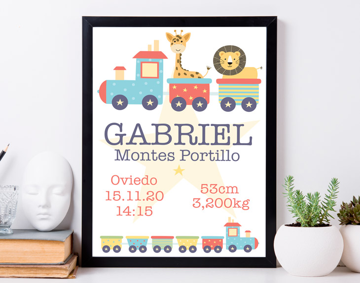 ¡Tu bebé ha llegado a casa! Ahora toca repensar la decoración, añadir juguetes que le gusten, y seguro que empezaréis también a colgar fotos del nuevo miembro de la familia. Para ayudarte a visualizar este nuevo estilo de vida, hemos creado esta lámina natalicia personalizada con un diseño que le encantará a tu bebé. ¡Y también te servirá a ti! Además de tener un precioso dibujo de un trenecito con animales, podrás inscribir todos los datos del nacimiento de tu hijo/a: dónde y cuándo nació, su peso, su altura... Así, este es el perfecto regalo original tanto para tu hijo/a como para ti: a él/ella le encantará el dibujo y a ambos os emocionará recordarlo con el paso del tiempo. ¡Ten este precioso recuerdo siempre a la vista en tu pared! Para ello, puedes elegir entre dos tamaños de lámina: el clásico A4 con marco o un tamaño más grande de 60x85 cm. Importante: El color del marco puede variar según stock.