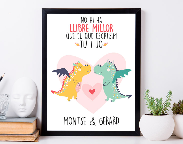 Si adoras la fiesta de Sant Jordi y todas las tradiciones que rodean a este día, ¡estás de suerte! Inspirados en una de las fechas más bonitas de nuestro calendario, hemos creado esta preciosa lámina personalizada No hi ha llibre millor. Un regalo especial y único con el que sorprender a esa persona que tanto queremos el próximo 23 de abril. Esta preciosa lámina personalizada tiene un divertido y romántico diseño inspirado en el día de Sant Jordi. En este caso, dos dragoncitos enamorados son los protagonistas del diseño, para decirle al mundo que vuestra historia de amor es la mejor del mundo. Al hacer el pedido, indica vuestros nombres durante la personalización y nosotros nos encargamos de hacerte llegar el regalo más romántico del año. Además, la lámina está disponible en dos tamaños diferentes: tamaño A4, que incluye un fino y elegante marco para exponer la lámina en tu rincón favorito de casa, y el tamaño gigante, de 60 x 85 centímetros, perfecto para los fans de los pósters. Nuestra lámina personalizada es un regalo original al que nadie podrá resistirse. Ya sea para completar tu regalo tradicional de rosa y libro o para sustituirlo por una opción más divertida y única, este detalla funciona genial. Importante: El color del marco puede variar según stock. Importante: El diseño puede escogerse en catalán o castellano, según la opción que más te guste.