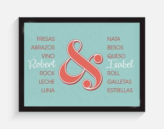 Nuestra lámina personalizada es perfecta para las parejas más perfectas del mundo. Si siempre os dicen que sois como la fresa y la nata o el chocolate y los churros, esta lámina está diseñada para vosotros. Para hacerlo mucho más especial e íntimo, guárdalo en secreto y sorprende a tu pareja en el momento más insospechado. Sin darte cuenta habrás creado un ambiente súper romántico y divertido en el que disfrutar de la compañía de la mejor persona del mundo. Es un regalo increíble para decorar vuestra nueva casa, por ejemplo. Importante: El color del marco puede variar según stock. Podrás elegir esta lámina en dos tamaños: A4 o gigante, este último con unas medidas de 85 x 60 centímetros.