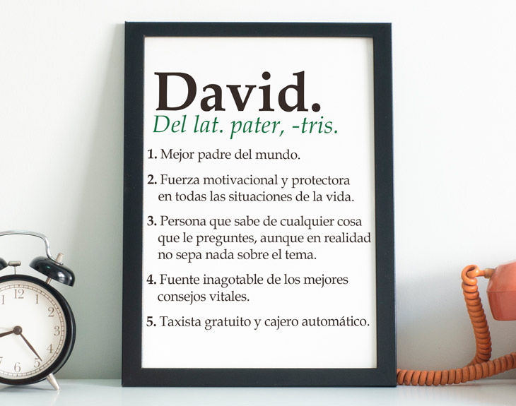 Nuestra lámina personalizada es perfecta para sorprender el Día del Padre. Si tu papá es el mejor del mundo y estas definiciones encajan a la perfección con lo que él es, dinos su nombre y tendrás regalo para sorprenderle. Podrá colgar esta lámina en la pared de su habitación para que le recuerde todos los días lo estupendo que es y que es el mejor papá del mundo. Además, tienes la opción de elegir dos tamaños de lámina: A4 o 60x85 cm. Importante: El color del marco puede variar según stock.