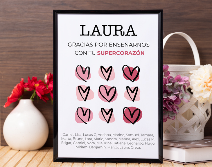 Esos profes que enseñan desde el corazón y ponen todo su cariño en enseñar a los más pequeños, se merecen todo lo mejor. Por eso, si queréis sorprenderle con regalo único, tenemos el mejor detalle. Nuestra lámina personalizada con diseño "Corazones del profe" es ideal. Es una preciosa de forma de agradecerle todo lo que habéis aprendido este año y lo mucho que os habéis divertido en sus clases. Además, esta lámina es personalizable, podrás escribir los nombres que tú quieras. Imagina la ilusión que le hará al profe recibir este regalo tan original, le encantará. Personalizar esta lámina es muy sencillo. El primer paso a seguir consiste en añadir el producto al carrito y entrar al área de personalización. Una vez ahí, ya puedes escribir todos vuestros nombres. ¡Quedará genial! Pronto estará perfecta y lista para regalar. ¡Será un original regalo para profes! Importante: Si escoges la opción "versión digital" te enviaremos el diseño por mail en alta resolución. De esta manera, tendrá la calidad necesaria para que puedas imprimirla en cualquier formato. En el formulario de entrega tendrás que seleccionar la opción "Recibir por Email para ahorrar los gastos de envío". Importante: El color del marco puede variar según stock.