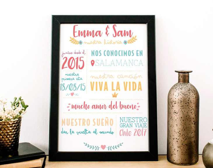 ¿Estás viviendo una preciosa historia de amor con la persona más buena del mundo? Es el momento de congelar algunos de los mejores momentos vividos en esta lámina personalizada. Solo tendrás que responder a unas breves preguntas para que podamos completar el diseño y hacerlo único para vosotros. Además, puede ser un regalo muy bonito si tenéis pensado mudaros juntos, por ejemplo. ¡Esta lámina inaugurará la pared de vuestra habitación! Además, tienes la opción de elegir dos tamaños de lámina: A4 o 60x85 cm. Importante: El color del marco puede variar según stock.