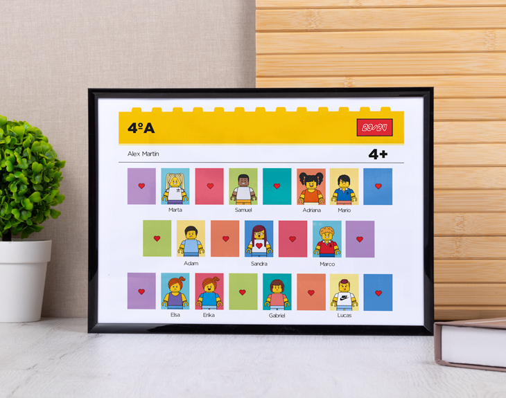 Ahora que llega el verano, llega la época de las despedidas con los compañeros y los profes. Si vuestro profe ha sido el mejor del mundo, tenemos el regalo de despedida perfecto. Se trata de nuestra lámina personalizada con diseño "Orla Lego", es una preciosa forma de agradecerle lo mucho que habéis aprendido durante sus clases. Esta lámina es ideal para colgarla en la pared, le dará un toque muy original. Lo mejor es que esta orla es personalizable, podrás crear a estos avatares Lego como tú quieras. Hay un montón de rasgos y accesorios distintos para elegir. Sin duda, esta lámina es un detalle perfecto que le hará mucha ilusión. ¡Nunca se olvidará de su clase favorita! Personalizar esta lámina es muy sencillo. El primer paso a seguir consiste en añadir el producto al carrito y entrar al área de personalización. Una vez ahí, ya puedes crear a estos avatares lego como tus compañeros y tu profe. ¡Es genial! Pronto estará perfecta y lista para regalar. ¡Será un original regalo para pofes! Importante: Si escoges la opción "versión digital" te enviaremos el diseño por mail en alta resolución. De esta manera, tendrá la calidad necesaria para que puedas imprimirla en cualquier formato. En el formulario de entrega tendrás que seleccionar la opción "Recibir por Email para ahorrar los gastos de envío". Importante: El color del marco puede variar según stock. Importante: Los huecos en los que no aparezca un personaje se incluirá un corazón.