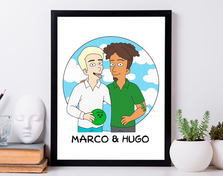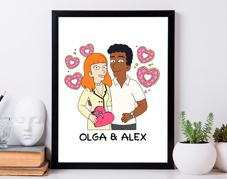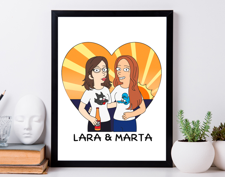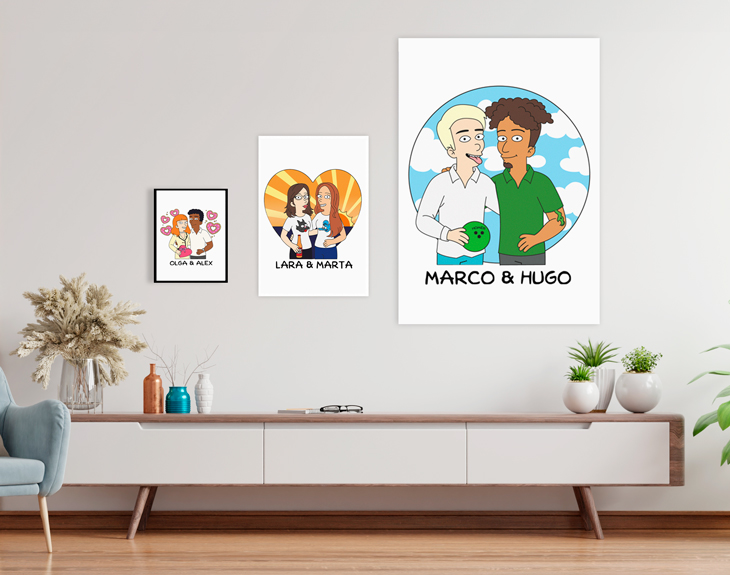 Encontrar a tu alma gemela puede parecer difícil, pero cuando realmente aparece esa persona que te hace sentir mariposas en el estómago, se merece todo el amor del mundo. Si os encanta ver juntos serie de animación, es el momento de hacerle el mejor regalo del mundo: su propia lámina personalizada! Es ideal si quieres tener un detalle único con tu pareja y decirle lo mucho que le quieres, porque esta lámina le dejará sin palabras. San Valentín o vuestro aniversario son los momentos perfectos para regalar a tu pareja esta original lámina en la que os podéis convertir en auténticos dibujos animados, como los de vuestra serie favorita. Se convertirá en vuestro adorno favorito para darle un toque único a vuestro hogar, porque quedará ideal en cualquier rinconcito de casa o de cualquier lugar. Además, contamos con dos tamaños de lámina, dependiendo del espacio que tengáis en casa: elige A4 o gigante, este último con medidas de 60 x 85 centímetros. ¡El A4 incluirá marco para tener el pack completo! El amor de tu vida se merece un regalo tan guay como este, por eso no puedes olvidarte de personalizar esta lámina para que sea única en el mundo. Podrás crear tus propios personajes desde cero con todos los detalles necesarios y listo. Así de fácil es crear este precioso recuerdo. ¡Quedará de lujo en la pared principal!