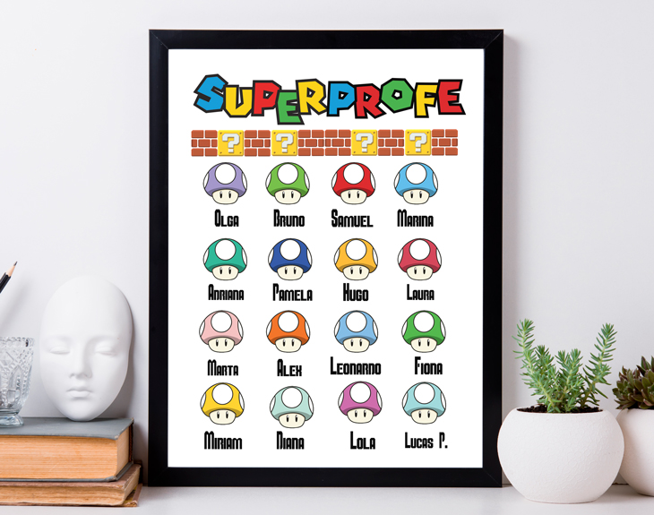 Ahora que llega el verano, también se acerca el fin de curso y con ello: las despedidas. Si os va a dar mucha pena despediros de vuestro profe favorito, está claro que tenéis que hacerle un regalo para que nunca se olvide de sus vosotros. Nuestra lámina personalizada con diseño "Superprofe Mario Bros" es el detalle perfecto. Y es que los profes tienen un papel muy importante, pueden conseguir que te diviertas en clase mientras aprendes, y que te guste mas o menos su asignatura. Por eso, si vuestro profe se ha preocupado de que aprendáis y es el mejor del mundo, esta lámina le encantará. Lo mejor es que es personalizable, podrás ecribir los nombres de tus compañeros de clase junto con el del profe. Personalizar esta lámina es muy sencillo. El primer paso a seguir consiste en añadir el producto al carrito y entrar al área de personalización. Una vez ahí, ya puedes escribir los nombres de los compañeros de la clase en estos champiñones del mario bros. ¡Quedará genial! Pronto estará perfecta y lista para regalar. ¡Será un regalo perfecto para profes! Importante: Si escoges la opción "versión digital" te enviaremos el diseño por mail en alta resolución. De esta manera, tendrá la calidad necesaria para que puedas imprimirla en cualquier formato. En el formulario de entrega tendrás que seleccionar la opción "Recibir por Email para ahorrar los gastos de envío". Importante: El color del marco puede variar según stock.