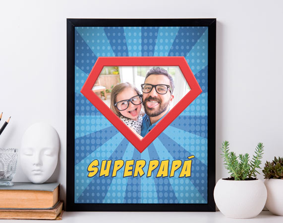 Si estás convencida o convencido de que tienes un superpapá en casa, esta lámina personalizada es perfecta para sacarle una enorme sonrisa. Elige la foto más cariñosa o la más divertida que tengas con tu padre, y disfruta de su cara de sorpresa en cuanto abra el regalo. Es un bonito detalle para el Día del Padre, por ejemplo, pero también para su cumpleaños o, simplemente, un día cualquiera que tengas ganas de decirte que le quieres. Tienes dos tamaños de lámina para elegir. Importante: El color del marco puede variar según stock. Podrás elegir esta lámina en dos tamaños: A4 o gigante, este último con unas medidas de 85 x 60 centímetros.