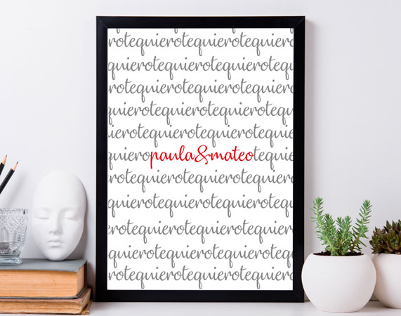 No hay manera más original y romántica para decir te quiero. Esta lámina personalizada guardará vuestros nombres para siempre envueltos en un mar de palabras "te quiero", con el fin de que vuestro amor dure para toda la vida. Está diseñado para las parejas más enamoradas del mundo, o para las que se acaban de comprometer. Es un regalo 100% romántico y perfecto para sacar una sonrisa a tu pareja. Dinos los nombres y lo tendrás listo para colgar en el rincón más íntimo. Importante: El color del marco puede variar según stock. Podrás elegir esta lámina en dos tamaños: A4 o gigante, este último con unas medidas de 85 x 60 centímetros.