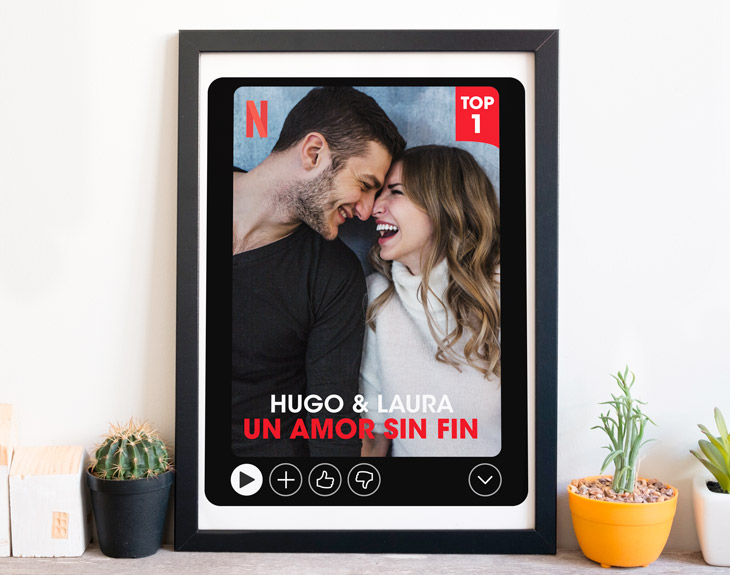 En el top de Netflix te puedes encontrar una enorme variedad de películas y series. Desde éxitos de público y crítica como 'El irlandés' o 'A ciegas' a series que nos rompen el corazón, como pueden ser 'Dark' o 'Stranger Things'. Si algo tienen en común todas estas obras audiovisuales es que el amor está presente, ya sea por una pequeña pareja o relación o como la trama que mueve toda la película o serie. Y es que el romance es el género que siempre conquista a cualquier espectador. Lo tiene todo para sorprendernos: relaciones con las que ilusionarte, química chispeante entre los protagonistas, muchas idas y venidas... ¿Te ves muy representado en este tipo de relaciones? Si crees que tu pareja y tú podríais protagonizar la nueva comedia romántica de Netflix, esta lámina personalizada está hecha para vosotros. Os transformaréis en uno de esos títulos tan queridos por los espectadores de Netflix. Si todo el mundo se queda embobado cada vez que contáis vuestra historia de amor, no se nos ocurre un regalo original para parejas más apropiado. Entra en nuestro diseñador y escoge la mejor foto de vuestra galería. ¡Será todo un detalle que podréis colgar en la pared de casa! Contamos con dos tamaños de lámina distintos: lámina junto con el marco a tamaño A4 y una lámina de tamaño póster, de 85x60 cm. ¡Escoge el que más te guste! Importante: El color del marco puede variar según stock.