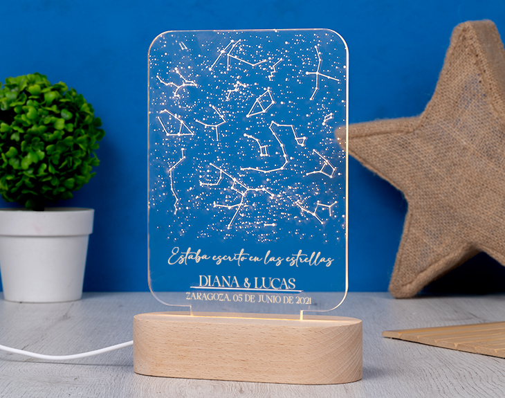 Ya se acerca una de las épocas más bonitas y románticas del año... ¡El día de los enamorados! Si este año tu pareja y tú vais a celebrar San Valentín, está claro que tienes que hacerle el regalo más románticos de todos. ¡Nuestra lámpara de metacrilato personalizada con diseño "Constelaciones" es ideal para esta ocasión! Lo más bonito de esta lámpara de metacrilato es que es personalizable. Por eso, si piensas que vuestro amor estaba escrito en el firmamento, regalar esta lámpara es una preciosa forma de demostrárselo a tu pareja. Y es que simplemente imagina la ilusión que le hará a tu pareja recibir este regalo tan bonito, sin duda, le encantará. Personalizar esta lámpara de metacrilato es súper sencillo. El primer paso a seguir consiste en añadir el producto al carrito y entrar al área de personalización. Una vez ahí, ya puedes escribir vuestros nombres en el firmamento. Pronto estará perfecto y listo para regalar. ¡Será un original regalo para enamorados! Funcionamiento: La lámpara funciona con un cable USB (incluido). La base negra cuenta con diferentes colores, que se pueden adaptar a tus gustos: si pulsas una vez te saldrá un color, si pulsas de nuevo, aparecerá otro, y así sucesivamente. También podrás elegir la opción intermitente: ¡todas las luces creando un festín de colores! Mientras tanto, la base de madera solo cuenta con una luz, que se apagará y se encenderá cada vez que aprietes el interruptor. Puedes escoger entre las siguientes bases: -Base negra: sus medidas son de 8,3cm (diámetro) x 4,8cm (alto), y está hecha de plástico. Cuenta con luces de colores. -Base de madera: sus medidas son de 14,5x6x3,5cm, y está hecha de madera. Cuenta con una sola luz, de color blanco. ¡Importante! Por muy poco más, puedes seleccionar la opción de tener la base grabada por un lado. Añade ese producto al carrito y podrás escribir un breve texto (nombres, fechas...) que irá grabado directamente sobre la madera para que dure eternamente. Medidas aproximadas: 13 x 18,4 cm (metacrilato). Importante: recomendamos no limpiar con líquidos, sólo con un paño en seco o ligeramente húmedo, y evitar los productos químicos. Importante: puede que el metacrilato llegue con un plástico protector.