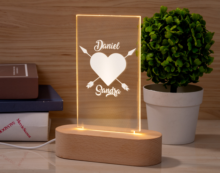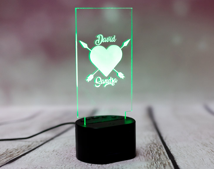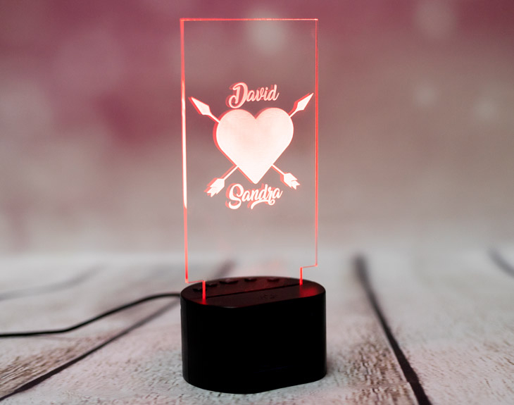 No hay regalo más romántico que una declaración de amor luminosa que te recuerda lo maravillosa que es tu vida sentimental. ¿Estás pensando en irte a vivir con tu pareja? Este regalo original es perfecto para sorprenderle y mandarle una indirecta: "¿Nos mudamos juntos?" Esta lámpara de metacrilato personalizada es perfecta para sorprender a la pareja más dulce y romántica del universo. Con las flechas del amor no hay quien esté de mala gana. ¡Que viva el romanticismo! Funcionamiento: La lámpara funciona con un cable USB (incluido). La base negra cuenta con diferentes colores, que se pueden adaptar a tus gustos: si pulsas una vez te saldrá un color, si pulsas de nuevo, aparecerá otro, y así sucesivamente. También podrás elegir la opción intermitente: ¡todas las luces creando un festín de colores! Mientras tanto, la base de madera solo cuenta con una luz, que se apagará y se encenderá cada vez que aprietes el interruptor. Puedes escoger entre las siguientes bases: -Base negra: sus medidas son de 8,3cm (diámetro) x 4,8cm (alto), y está hecha de plástico. Cuenta con luces de colores. -Base de madera: sus medidas son de 14,5x6x3,5cm, y está hecha de madera. Cuenta con una sola luz, de color blanco. Medidas aproximadas: 13 cm x 17 cm (metacrilato). Importante: puede que el metacrilato llegue con un plástico protector.