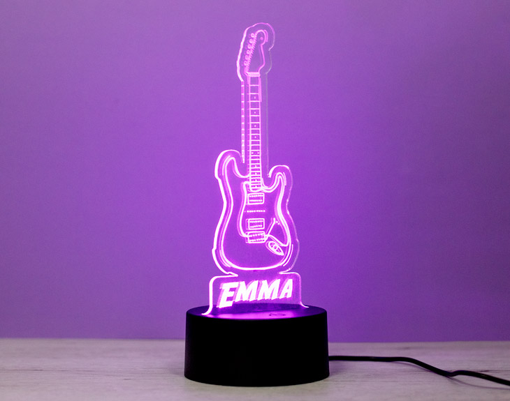 La estética de luces chillonas en la oscuridad te hará sentir vivo si eres un fan del rock. ¡No hay nada más molón que una buena guitarra eléctrica! Seguro que estás acostumbrado a escucharla en los temazos de grandes grupos como los Rolling Stones o Mago de Oz. Pues ya es hora de que tengas una en tu casa, y no hace falta ni que sepas tocarla. Lo único que tendrás que hacer es enchufarla y tocar un botón para ver cómo luce esta lámpara de metacrilato personalizada. ¡Ningún músico del mundo tendrá una como la tuya!