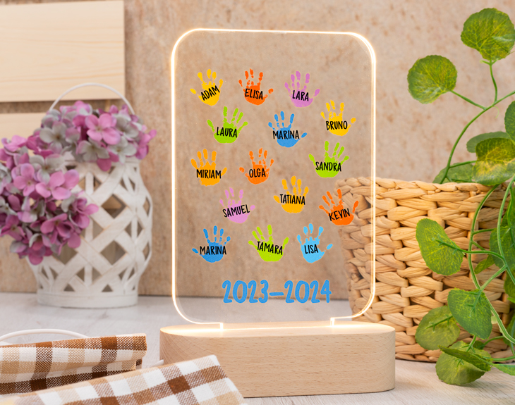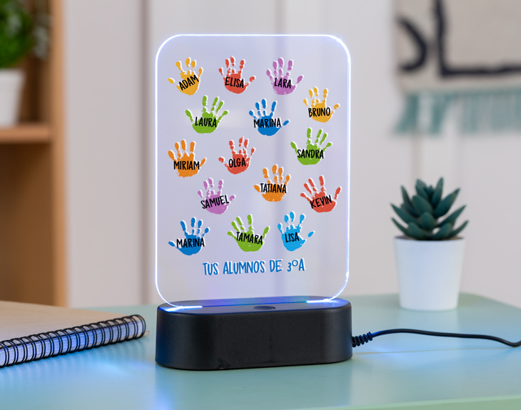 Seguro que alguno de los profesores que se han cruzado en tu camino han sido todo un referente para ti o para tus hijos. Su vocación y pasión por la enseñanza hacen que aprendamos mucho de ellos y consiguen marcar nuestro camino. Por eso, como sabemos profes y alumnos se dejan huella mutuamente, esta lámpara de metacrilato personalizada es el regalo perfecto para todos los profes. No hay mejor detalle que esta lámpara tan bonita y con un diseño tan emotivo como este. ¡Robará el corazón de cualquier profe! Nos han enseñado tantas cosas a lo largo de nuestra etapa escolar, que solo por eso los profes se merecen todo el reconocimiento del mundo. Pero si queréis tener un detalle con ese profe que os ha marcado, será súper guay regalarle esta original lámpara el último día de clase. Seguro que no se espera un regalo tan guay y quizá se le escape alguna lagrimilla de la emoción. ¡Podrá decorar cualquier rinconcito de casa con este regalazo! Pero lo mejor de este regalo es que podrás personalizar esta lámpara de metacrilato para tu profe favorito. Elige qué tipo de base quieres para la lámpara y añade el producto al carrito. Ahí, podrás elegir el número de huellas que tienes y después escribir sobre cada una de ellas el nombre de todos los alumnos y colocarlos a tu gusto. ¡Será el mejor regalo que le hayan hecho nunca! Funcionamiento: La lámpara funciona con un cable USB (incluido). La base negra cuenta con diferentes colores, que se pueden adaptar a tus gustos: si pulsas una vez te saldrá un color, si pulsas de nuevo, aparecerá otro, y así sucesivamente. También podrás elegir la opción intermitente: ¡todas las luces creando un festín de colores! Mientras tanto, la base de madera solo cuenta con una luz, que se apagará y se encenderá cada vez que aprietes el interruptor. Puedes escoger entre las siguientes bases: -Base negra: sus medidas son de 13 x 6 cm, y está hecha de plástico. Cuenta con luces de colores. -Base de madera: sus medidas son de 14,5 x 6 x 3,5 cm y está hecha de madera. Cuenta con una sola luz, de color blanco. ¡Importante! Por muy poco más, puedes seleccionar la opción de tener la base de madera grabada por un lado. Añade ese producto al carrito y podrás escribir un breve texto (nombres, fechas...) que irá grabado directamente sobre la madera para que dure eternamente. Medidas aproximadas del metacrilato: 13 x 17 cm. Importante: recomendamos no limpiar con líquidos, sólo con un paño en seco o ligeramente húmedo, y evitar los productos químicos. Importante: puede que el metacrilato llegue con un plástico protector.
