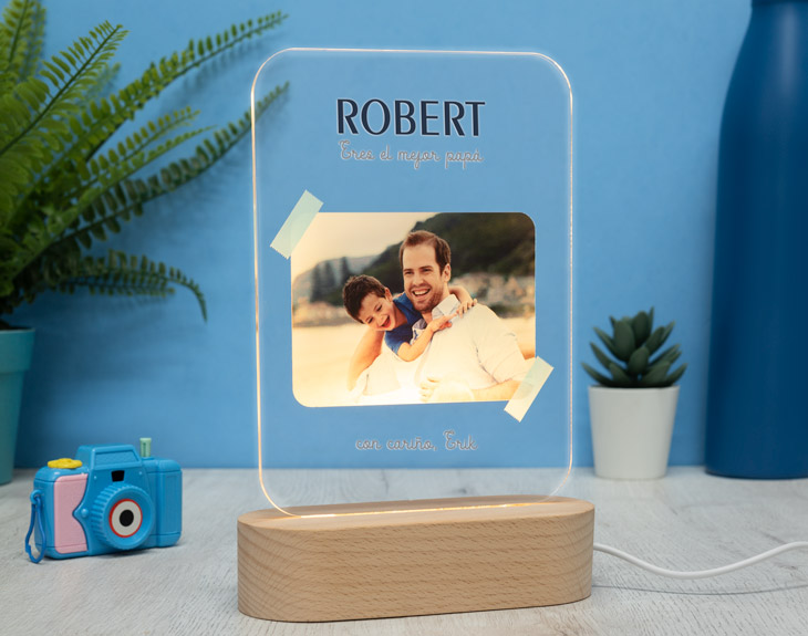 Un padre siempre está ahí para nosotros, cuando más le necesitamos para ayudarnos y apoyarnos en lo bueno y lo malo. Son de las personas más importantes de nuestra vida y por todo lo que han hecho desde que somos pequeños se merecen todo. Por eso, si quieres sorprender a tu padre con un regalo diferente y muy especial, esta lámpara de metacrilato personalizada es perfecta para cualquier fecha señalada. Esta lámpara es un detalle hecho especialmente para todos los padres del mundo, además de ser un regalo que seguro que no se espera y le hará muchísima ilusión recibir. ¡Triunfarás seguro! Ocasiones como el Día del Padre o su cumpleaños, son fechas muy especiales en las que queremos decirle a nuestro padre que le queremos y que es el mejor. Y no hay mejor manera de hacerlo que con esta original lámpara de metacrilato con diseño para papá. Esta preciosa lámpara está formada por un metacrilato y una base a elegir. El diseño va impreso en la placa de metacrilato, que tiene unas medidas de 18,4 centímetros de alto y 13 centímetros de ancho. También, podrás elegir qué base quieres: la de madera con luz blanca o la negra con luces de varios colores y con un tamaño un poco más pequeño. ¡Tú decides! Seguro que ya estás pensando en personalizar esta lámpara de metacrilato. ¡Es muy sencillo! Primero escoge la opción de lámpara que más te guste, después dentro del diseño, añade el nombre de tu padre y aquello que le quieras decir y quieres que quede impreso en el metacrilato. ¡Es un regalo de lo más entrañable! Podrás elegir también grabar un mensaje en la base de madera por muy poquito más. Nosotros nos ocupamos del resto para que quede perfecto. Funcionamiento: La lámpara funciona con un cable USB (incluido). La base negra cuenta con diferentes colores, que se pueden adaptar a tus gustos: si pulsas una vez te saldrá un color, si pulsas de nuevo, aparecerá otro, y así sucesivamente. También podrás elegir la opción intermitente: ¡todas las luces creando un festín de colores! Mientras tanto, la base de madera solo cuenta con una luz, que se apagará y se encenderá cada vez que aprietes el interruptor. Puedes escoger entre las siguientes bases: -Base negra: sus medidas son de 8,3 x 4,8 cm, y está hecha de plástico. Cuenta con luces de colores -Base de madera: sus medidas son de 14,5 x 6 x 3,5 cm, y está hecha de madera. Cuenta con una sola luz, de color blanco ¡Importante! Por muy poco más, puedes seleccionar la opción de tener la base de madera grabada por un lado. Añade ese producto al carrito y podrás escribir un breve texto (nombres, fechas...) que irá grabado directamente sobre la madera para que dure eternamente. Importante: recomendamos no limpiar con líquidos, sólo con un paño en seco o ligeramente húmedo, y evitar los productos químicos. Importante: puede que el metacrilato llegue con un plástico protector. Medidas del metacrilato: 18,4 x 13 cm.