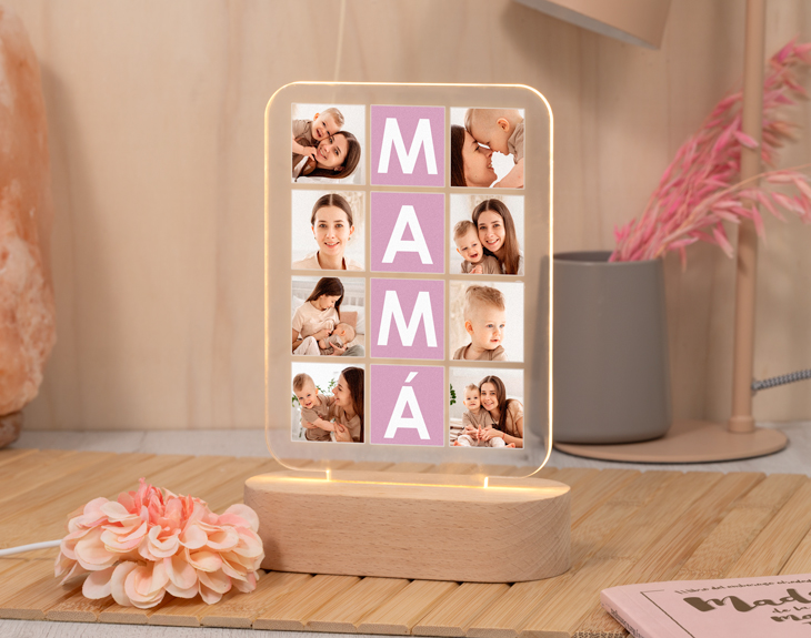 ¿Te imaginas despertar cada día y ver en la mesita de noche vuestras fotos favoritas? ¡No hay mejor manera de empezar la jornada! Ahora podrás darle este gustazo a tu madre con nuestra lámpara de metacrilato personalizada. Únicamente tienes que escoger ocho fotos, esas que consiguen trasladaros a vuestros mejores recuerdos, e insertarlas en el diseño. En todo momento podréis ver una previsualización y hacer los cambios que hagan falta, ajustar el tamaño de la foto, cambiar la distribución o sustituirla por otra que te convenza más. El diseño está disponible en varios colores diferentes, ¡podrás escoger el preferido de mamá! Además, tenemos dos tipos de base, una de madera más elegante y minimalista con luz blanca y una negra de plástico que tiene opción de luces multicolor, ¡super divertida! Si todavía no has encontrado el regalo perfecto para mamá aquí tienes la solución. Un detalle único, muy especial y perfecto para decorar cualquier rincón de la casa, en resumen, ¡un acierto asegurado! Funcionamiento: La lámpara funciona con un cable USB (incluido). La base negra cuenta con diferentes colores, que se pueden adaptar a tus gustos: si pulsas una vez te saldrá un color, si pulsas de nuevo, aparecerá otro, y así sucesivamente. También podrás elegir la opción intermitente: ¡todas las luces creando un festín de colores! Mientras tanto, la base de madera solo cuenta con una luz, que se apagará y se encenderá cada vez que aprietes el interruptor. Puedes escoger entre las siguientes bases: -Base negra: sus medidas son de 8,3x4,8cm, y está hecha de plástico. Cuenta con luces de colores -Base de madera: sus medidas son de 14,5x6x3,5cm, y está hecha de madera. Cuenta con una sola luz, de color blanco. ¡Importante! Por muy poco más, puedes seleccionar la opción de tener la base de madera grabada por un lado. Añade ese producto al carrito y podrás escribir un breve texto (nombres, fechas...) que irá grabado directamente sobre la madera para que dure eternamente. Importante: recomendamos no limpiar con líquidos, sólo con un paño en seco o ligeramente húmedo, y evitar los productos químicos. Importante: puede que el metacrilato llegue con un plástico protector. Medidas del metacrilato: 17,5 x 12 cm.