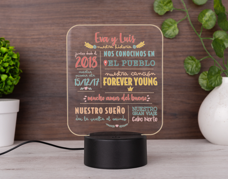 ¿Quién es esa persona que aporta tanta luz a tu vida? Todas las experiencias que habéis vivido juntos, esas fechas tan marcadas en vuestro calendario, vuestras canciones y sueños compartidos... ¡Tenéis una gran historia que llena de color vuestras vidas! Y ahora también podrá iluminar cualquier parte de vuestro hogar con esta lámpara de metacrilato personalizada. Puedes personalizar totalmente a medida este diseño con luz. Tan solo tienes que añadir el producto al carrito y escribir todas esas cosas que habéis compartido juntos. ¡Mira la previsualización y disfruta de lo preciosa que queda vuestra historia sobre el metacrilato transparente! Gracias a sus reducidas dimensiones, podrás colocarlo fácilmente en tu salón o tu habitación, cualquier sitio de la casa con un puerto USB bastante cercano. Enchúfalo y escoge entre todos los colores disponibles (mostrados en las imágenes del pasador) el favorito de tu pareja, para sorprenderla con un precioso regalo romántico original para San Valentín o celebrar vuestro aniversario. Funcionamiento: La lámpara funciona con un cable USB (incluido). La base negra cuenta con diferentes colores, que se pueden adaptar a tus gustos: si pulsas una vez te saldrá un color, si pulsas de nuevo, aparecerá otro, y así sucesivamente. También podrás elegir la opción intermitente: ¡todas las luces creando un festín de colores! Mientras tanto, la base de madera solo cuenta con una luz, que se apagará y se encenderá cada vez que aprietes el interruptor. Puedes escoger entre las siguientes bases: -Base negra: sus medidas son de 8,3cm (diámetro) x 4,8cm (alto), y está hecha de plástico. Cuenta con luces de colores. -Base de madera: sus medidas son de 14,5x6x3,5cm, y está hecha de madera. Cuenta con una sola luz, de color blanco. Medidas aproximadas del metacrilato: 13x17cm. Importante: recomendamos no limpiar con líquidos, sólo con un paño en seco o ligeramente húmedo, y evitar los productos químicos. Importante: puede que el metacrilato llegue con un plástico protector.