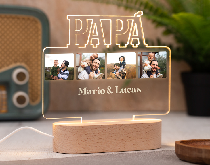 Llega un punto en que es muy difícil saber qué regalar a un padre por su cumpleaños, por el Día del Padre... Ya tiene toda la ropa y complementos de hombre que quiere, todos los dispositivos electrónicos que necesita... En ese punto, solamente hay una cosa que le sigue haciendo especial ilusión: ¡los recuerdos! Seguro que le encanta volver a aquellos momentos con vosotros, sus hijos, cuando celebrabais comidas, ibais al parque... Para que lo haga de la manera más original posible, haz que recupere la sonrisa de su cara con esta lámpara de metacrilato personalizada. ¡Se acabaron los tradicionales marcos de fotos! Este año, con muy poco esfuerzo puedes encargar a domicilio y recibir en la puerta de tu casa el mejor regalo original para padres. Añádelo al carrito y diviértete personalizando la placa transparente de metacrilato con vuestras fotos más divertidas y graciosas. Además, ¡hasta puedes escribirle un breve texto! Piensa qué mensaje bonito quieres recordarle a tu papá cada vez que te recuerde mirando la luz de esta lámpara. Los tendrá todos impresos a color y relucientes cada vez que pinche el botón. Ya sea con luces de colores o con una blanca fija, esta lámpara de metacrilato con fotos y bases de colores será su nuevo adorno favorito para la mesita de noche o en su oficina de trabajo. Las reducidas medidas de las bases y la consistencia del metacrilato facilitan que lo pueda poner como elemento de decoración en cualquier superficie sin necesidad de otro apoyo. Funcionamiento: La lámpara funciona con un cable USB (incluido). La base negra cuenta con diferentes colores, que se pueden adaptar a tus gustos: si pulsas una vez te saldrá un color, si pulsas de nuevo, aparecerá otro, y así sucesivamente. También podrás elegir la opción intermitente: ¡todas las luces creando un festín de colores! Mientras tanto, la base de madera solo cuenta con una luz, que se apagará y se encenderá cada vez que aprietes el interruptor. Puedes escoger entre las siguientes bases: -Placa de madera (sin luz): 12,8x4,8x2,6cm -Base negra: sus medidas son de 8,3cm (diámetro) x 4,8cm (alto), y está hecha de plástico. Cuenta con luces de colores. -Base de madera: sus medidas son de 14,5x6x3,5cm, y está hecha de madera. Cuenta con una sola luz, de color blanco. ¡Importante! Por muy poco más, puedes seleccionar la opción de tener la base de madera grabada por un lado. Añade ese producto al carrito y podrás escribir un breve texto (nombres, fechas...) que irá grabado directamente sobre la madera para que dure eternamente. Importante: recomendamos no limpiar con líquidos, sólo con un paño en seco o ligeramente húmedo, y evitar los productos químicos. Importante: puede que el metacrilato llegue con un plástico protector. Medidas del metacrilato 17,5 x 12 cm.