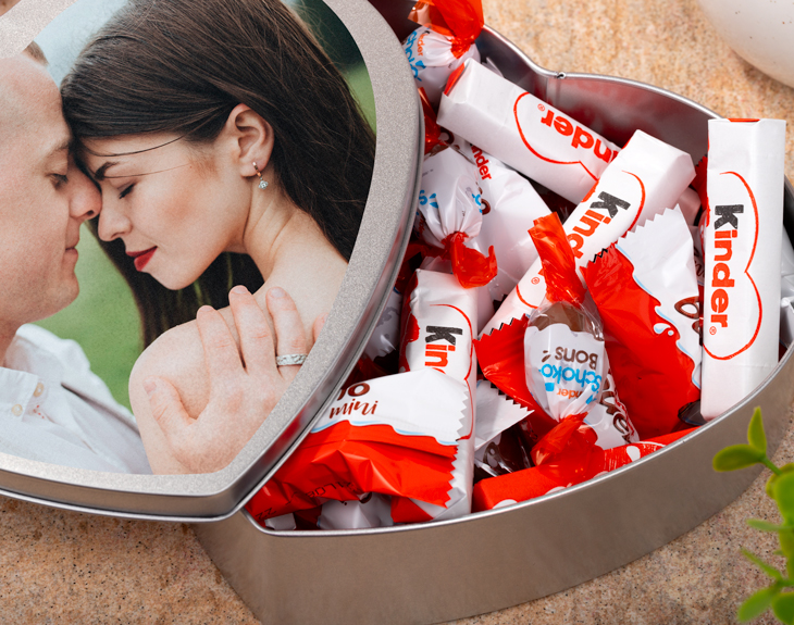 Si estás pensando en una fiesta increíble para sorprender a una persona especial, seguro que se te ha pasado por la cabeza añadir chocolate a ese acontecimiento. Y, ¿por qué no hacerlo de una manera súper original? Esta lata corazón personalizada es perfecta para sorprender a cualquiera que le encante el chocolate. ¿Cuántas veces te ha dicho esa persona que no puede vivir sin Kinder? Pues esta lata incluye en su interior un buen número de distintas chocolatinas Kinder. Aprovecha esta oportunidad y personaliza la tapa de la lata. Solo tendrás que buscar una foto especial para que la imprimamos en un vinilo. ¡Es un regalo perfecto! Medidas: 18 cm x 16 cm. Contenido del interior: - 8 Kinder chocolate - 15 Kinder Bueno - 15 Schoco-bons Importante: Las chocolatinas pueden variar según stock, pero no te preocupes estarán igual de deliciosas. Importante: El color de la lata puede variar en función del stock, pero no tendrás de qué preocuparte. ¡Quedará genial!