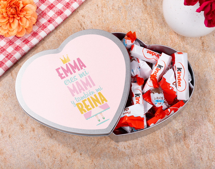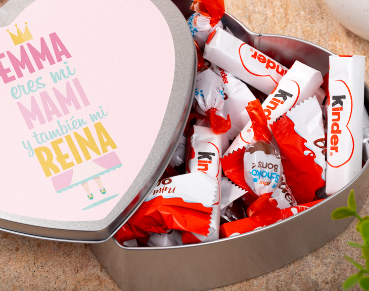 Tu madre siempre se ha dedicado a servirte a ti y a tanta otra gente. Pero por ello mismo, ¡es la mejor reina de todas! La que siempre se preocupa por el resto. Esta vez, le toca a ella ser servida y disfrutar con esta lata en forma de corazón personalizada. Un regalo tan sabroso como merecido y bonito para sorprenderla con emotividad en el Día de la Madre o en su cumpleaños. Si no sabes qué productos gastronómicos regalar a tu madre, ¡ve a lo seguro! Da igual la edad que tenga, no hay quien se resista a este surtido de chocolatinas Kinder. Desde las clásicas barritas hasta los crujientes Kinder bueno, podrá tener siempre a mano estas barritas mini de chocolate para picar entre horas. Personaliza con el nombre de tu mamá este diseño de colores rosa y amarillo con una corona para la mejor reina del mundo. ¡Seguro que luego guarda de recuerdo la lata con este diseño personalizado para madres! Medidas: 18 cm x 16 cm. Contenido del interior: - 8 Kinder chocolate - 15 Kinder Bueno - 15 Schoco-bons Importante: Las chocolatinas pueden variar según stock, pero no te preocupes estarán igual de deliciosas. Importante: El color de la lata puede variar en función del stock, pero no tendrás de qué preocuparte. ¡Quedará genial!