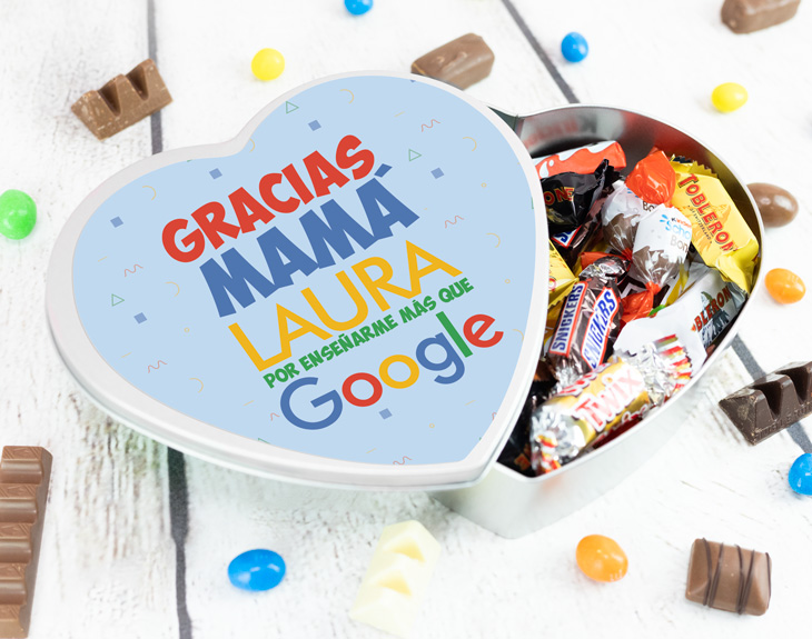 ¿Nunca has escuchado que el chocolate es bueno para el cerebro? Seguro que ese es uno de los secretos de tu madre para saber tanto como te ha enseñado: a hablar, a vestirte, a estudiar… Si ella te ha sido más útil y necesaria que Google, agradéceselo con esta lata en forma de corazón personalizada. Ya sea para picar entre horas, cuando esté en el trabajo o al salir del gimnasio, seguro que necesita un buen chute de azúcar. Entre este surtido de las mejores chocolatinas clásicas seguro que están las favoritas de tu mamá: los míticos Toblerone, los famosos Kinder o los deliciosamente rellenos Twix. ¡Seguro que no puede evitar compartirlo con vosotros! Da igual la carrera que haya estudiado: tu mamá seguro que te ha enseñado más que Google. Por ello, merece ver su nombre escrito sobre este diseño personalizado para madres. ¡Será un bonito recuerdo de un Día de la Madre especial! Medidas: 18 cm x 16 cm. Contenido del interior: - 4 Mini Kinder Bueno - 4 Chocobons - 2 Kinder Chocolate - 2 Mini Toblerone chocolate con leche - 2 Mini Toblerone chocolate negro - 2 Mini Toblerone chocolate blanco - 2 Mini Mars - 2 Mini Snickers - 2 Mini Twix Importante: Las chocolatinas pueden variar según stock, pero no te preocupes, se sustituirán por otras que estarán igual de deliciosas. Importante: El color de la lata puede variar en función del stock, pero no tendrás de qué preocuparte. ¡Quedará genial!