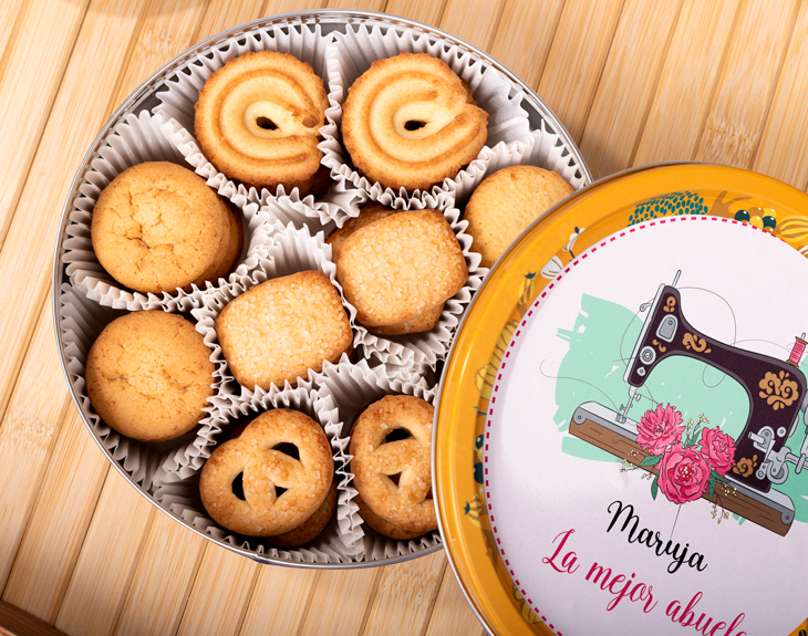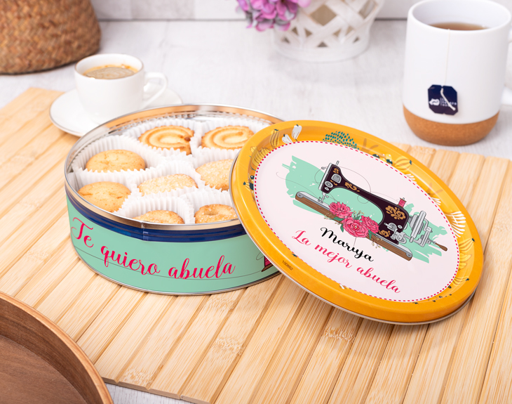 ¿Quién no ha ido alguna vez a casa de su abuela y se ha zampado una caja casi entera de galletas? Esto era una de las mejores cosas de visitar a la yaya los domingos: comer y de poster una buen ración de galletas. Para todas esas abuelas que siempre reutilizan la caja como costurero contamos con esta lata de galletas personalizada. ¡Podrá guardar todas sus agujas e hilos en su interior! Estas galletas de mantequilla son el mejor acompañamiento para una buena taza de café o té. Por eso esta lata de galletas con diseño para abuelas es perfecta para sorprender a la mejor costurera que conoces. Su diámetro es de 19 centímetros y una altura de 6,5 centímetros. Hay galletas de diferentes formas... ¡E incluso algunas con chocolate! Cuenta con dos vinilos que irán pegados, tanto en el lomo como en la tapa. Sabemos perfectamente cómo va a terminar este regalo original para abuelas, por eso queremos que este diseño sea tan especial como cuqui. A la hora de personalizar este diseño para las abus más costureras, solo tendrás que añadir el producto al carrito y entrar en el diseñador. ¡Ahí podrás personalizar tanto la tapa como el lateral de la caja! Escribe el nombre de la mejor abuela en la tapa, y luego podrás escribir el texto que quieras en el lateral. ¡Será la mejor sorpresa para ella! Diámetro: 19 cm. Peso: 227g aprox.