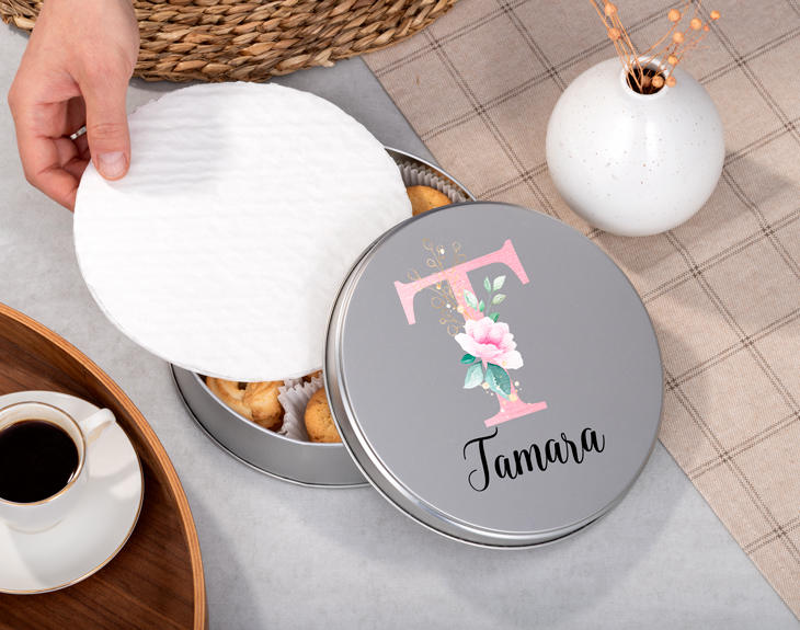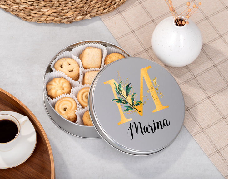 Las abuelas siempre tienen muchas comidas diferentes para cebarnos cuando llegamos a su casa. Un buen cocido, unos filetes rusos, y de postre... ¡Un poco de leche con galletas! Para completar este plan contamos con algo que no puede faltar en el hogar de cualquier abuela: esta lata de galletas personalizada es mítica y no puede faltar en ninguna casa. ¡Son adictivas! Esta lata de galletas con diseño de letras botánicas será el acompañamiento perfecto para cualquier taza de café o té... ¡O incluso para las visitas familiares! Esta lata está hecha de metal, cuenta con un diámetro de 19 centímetros y tiene un peso de 277 gramos. ¡En su interior podrá encontrar una selección de diferentes galletas de mantequilla! Además, queremos que este regalo original sea lo más completo posible. ¿Quieres tener un detalle con esa persona elegante que se siente orgullosísima de su nombre? ¡Este diseño de inicial botánica es perfecto! Primero, una vez que hayas añadido el producto al carrito y hayas entrado en el área de personalización, tendrás que escoger la inicial que quieres para el diseño. Una vez hayas escogido la letra del alfabeto, solo tendrás que escribir el nombre en la plantilla del lateral de la lata. ¡Un regalo perfecto para cualquier persona a la que le guste el dulce! Diámetro: 19 cm. Peso: 277g aprox.