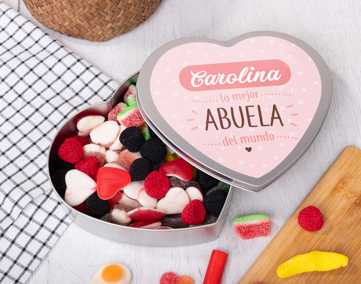 Todos nos merecemos una buena ración de chuches para endulzarnos la vida un poquito más. ¿Cuál es vuestra gominola favorita? ¡Hay tanta variedad que uno no sabe cuál escoger! Puede que sea el delicioso plátano, o el salado ladrillo de chuche, o puede que una riquísima mora roja o negra. Todas están de lo más ricas, y no todo el mundo podría quedarse con una en particular. ¿La abuela de la familia es una de esas personas indecisas que no puede elegir una chuche favorita? Seguro que a lo largo de su vida ha probado de todo, pero poquitas cosas enganchan más que unos riquísimos dulces. Si quieres hacerle un regalo de lo más rico y especial a esa abuela que siempre ha estado ahí, la lata de corazón personalizada le hará la boca agua. Este regalo original está hecho exclusivamente para todas abuelas que se han desvivido para darle a su familia lo mejor, para las mejores abuelas que pueden existir en este mundo. Añade el nombre de la mejor abuela y hazle un regalo inolvidable el próximo Día de la Madre. Medidas: 18 cm x 16 cm. Importante:Las chucherías pueden variar según stock. Importante: El color de la lata puede variar en función del stock, pero no tendrás de qué preocuparte. ¡Quedará genial! Importante: si puedes tener reacción a cualquier tipo de alérgenos, puedes escribirnos para consultar si hay alguna opción alternativa.