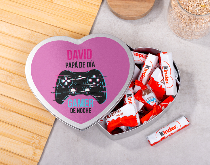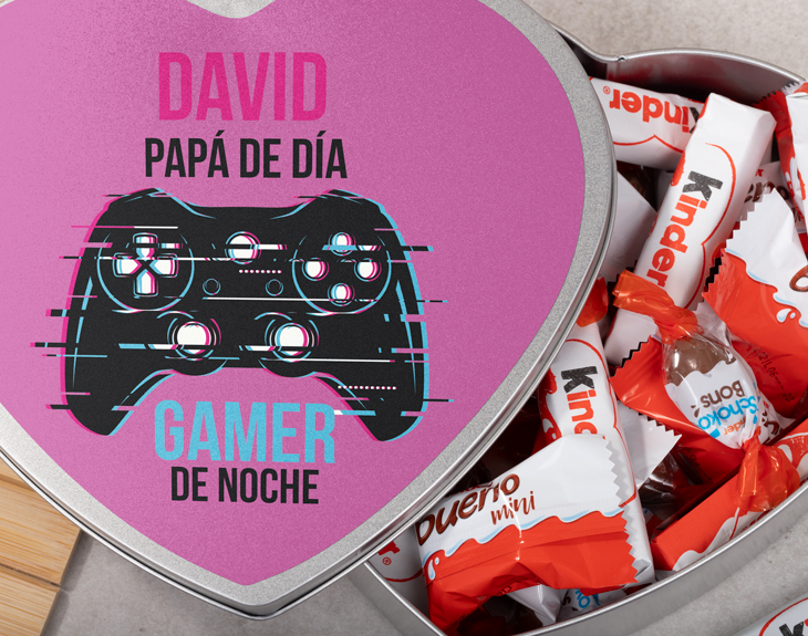 ¿A tu padre le encantan los videojuegos? Si desde muy pequeños le recordáis con un mando siempre de la mano, esta lata personalizada tiene su nombre. Se trata del detalle perfecto para endulzar el día y recordarle lo muchísimo que le queréis. Además, si es la persona más golosa que conoces y le pierde el chocolate, esta lata llena de Kinder le encantará. Seguro que más de una vez se ha quedado hasta las tantas de la madrugada jugando y comiendo chocolatinas. ¡Seguro que se quedará sin palabras al ver este detallazo! Solamente tienes que decirnos su nombre para añadirlo al diseño y podréis sacar una sonrisa al hombre de vuestra vida, ¡se lo merece más que nadie!. Medidas: 18 cm x 16 cm. Contenido del interior: - 8 Kinder chocolate - 15 Kinder Bueno - 15 Schoco-bons Importante: Las chocolatinas pueden variar según stock, pero no te preocupes estarán igual de deliciosas. Importante: El color de la lata puede variar en función del stock, pero no tendrás de qué preocuparte. ¡Quedará genial!