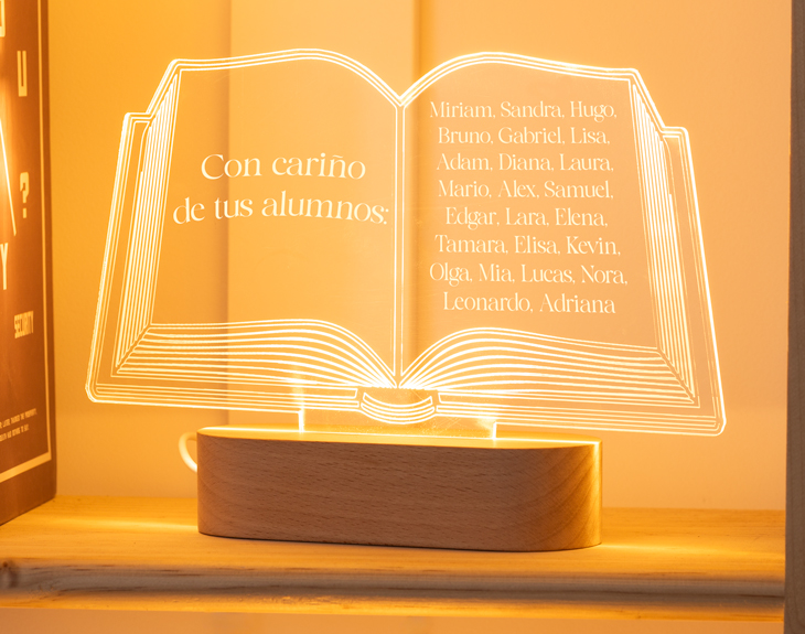 El libro de alumnos personalizado más original que hayas podido ver. Grabamos todo el texto que nos digas para que el libro sea único y tu profesor o profesora pueda disfrutar de él todos los días. Es una preciosa y tierna manera de dejar huella en el colegio. El metacrilato tiene forma de libro, como puedes observar, y está sujeto a un sistema de luces muy divertido. El libro se ilumina con diferentes colores de luces: tu profesora podrá disfrutar de un libro azul, otro rojo y otro rosa. ¡Es un elemento decorativo con mucho significado! Medidas libro: 12,5 cm x 24 cm.