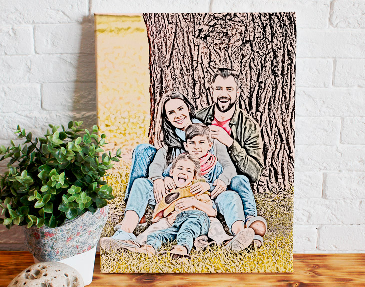 • Lienzo cuandrado.(se entrega montado listo para colgar). • Efecto Comics. • Bastidor de 3cm de madera samba. • Tintas con protección para rayos UV. • Tarjeta Recordatoria.