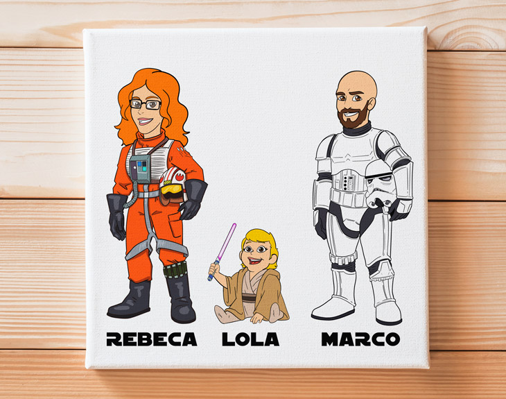 En el grandioso universo de 'Star Wars' podemos encontrar una infinidad tremenda de personajes. Sith, Jedis, androides y todo tipo de criaturas surrealistas son algunos de los personajes que habitan en este galáctico mundo que a tantas personas ha enamorado a lo largo de estos años. Darth Vader, Luke, Han Solo... ¿quién no se ha enamorado de estos personajes? Si alguna vez habéis vibrado con las increíbles aventuras de los Skywalker, has encontrado un regalo que sorprenderá a cualquier fan de 'Star Wars' que se precie de serlo. Y es que este lienzo personalizado es muy especial... ¡te convertirás en un personaje más de este fantástico mundo! ¿Siempre te has identificado con las aventuras de Luke y Leia? ¿Eres un fanático de la resistencia galáctica? ¿Te gustaría pasarte al lado oscuro de la Fuerza? Con este regalo original, podrás escoger tu propio personaje del mundo creado por George Lucas e incluirlo en un lienzo. ¡Quedará de lo más chulo en cualquier pared de tu casa! • Los laterales quedan envueltos con el propio lienzo. • Bastidor de 3cm de madera samba. • Tintas con protección para rayos UV. Importante: a partir de 6 personajes, la familia irá distribuida en dos filas. Es decir: - Familia de 6 personajes: 3 en la fila superior, y 3 en la inferior. - Familia de 7 personajes: 4 en la fila superior, y 3 en la inferior. - Familia de 8 personajes: 4 en la fila superior, y 4 en la inferior.