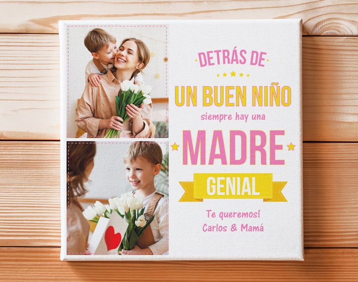 Una madre puede ser genial por muchas cosas: por ser la mejor madre, la mejor compañera, la mejor amiga, la mejor consejera, la mejor cocinera... ¡Se merece todo! Si quieres decirle que es una madre genial y no quieres que se olvide, hazlo con este lienzo personalizado. Será el regalo perfecto para todas las mamis, les encantará utilizarlo como decoración para cualquier rinconcito de casa, le dará un toque de lo más especial. Sabemos que a veces sorprender a mamá puede resultar un poco difícil, pero con este original lienzo cuadrado será muy sencillo. Se convertirá en un regalo único y genial para fechas como el Día de la Madre o su cumpleaños. Deja a un lado los típicos regalos que siempre le has hecho y apuesta por este detalle tan original y diferente que podrás crear especialmente para ella. Personaliza este lienzo para que sea el regalo favorito de mamá. Primero elige el tamaño que más se ajusta a tus necesidades, desde 30 hasta 95 centímetros. Después crea tu diseño añadiendo vuestras fotos favoritas y poniendo el texto que quieras en la parte inferior de este lienzo. ¡Listo para decorar vuestro hogar! • Los laterales quedan envueltos con el propio lienzo. • Bastidor de 3cm de madera samba. • Impresión a 1440dpi. • Tintas con protección para rayos UV. • Lienzo de algodón de alta calidad ultra blanco de 415 gramos. • Se entrega montado, listo para colgar.