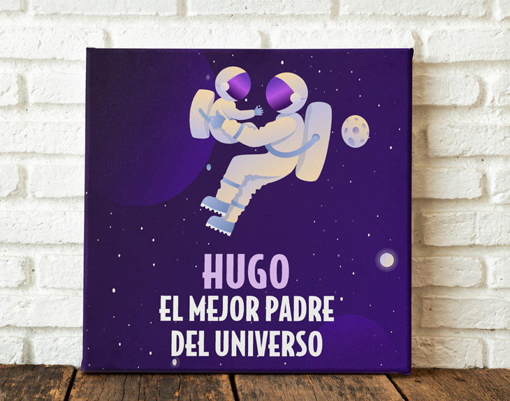 ¿Te imaginas la cara que pondría tu padre si entra en su cuarto y se encuentra un lienzo personalizado como este?¡No sabría ni qué hacer de la ilusión! Ahora puedes hacerlo realidad sorprendiéndole con un regalo así de original en el Día del Padre o en su cumpleaños. Y es que a veces se nos olvida decir lo mucho que queremos a las personas que más se lo merecen. Estamos seguros que aunque tu padre y discutáis de vez en cuando es una de las personas más importantes de tu vida. Por eso, es el momento de demostrárselo de la manera más emotiva. Solamente tienes que decirnos su nombre para que podamos insertarlo en este diseño tan tierno. Y es que, si de su mano recorrerías el universo entero y su simple presencia hace que te sientas mucho más fuerte, este dibujo os representa a la perfección. ¡Le encantará! • Los laterales quedan envueltos con el propio lienzo. • Bastidor de 3cm de madera samba. • Impresión a 1440dpi. • Tintas con protección para rayos UV. • Lienzo de algodón de alta calidad ultra blanco de 415 gramos. • Se entrega montado, listo para colgar.