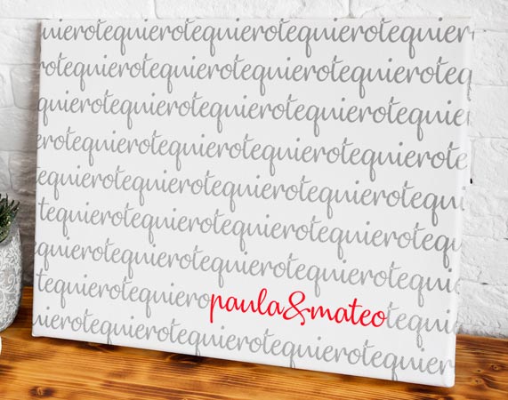 Un lienzo fino, elegante y lleno de romanticismo. Eso es lo que puedes encontrar aquí. Imagínatelo: las palabras del amor, "te quiero", escritas una y otra vez en el lienzo. Y en un ladito, vuestros nombres. • Los laterales quedan envueltos con el propio lienzo. • Bastidor de 3cm de madera samba. • Tintas con protección para rayos UV. • Se entrega montado, listo para colgar.