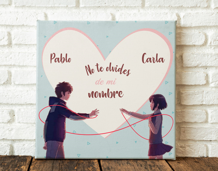¿Habéis visto la película de Your Name? Seguro que sí, porque, a pesar de ser de origen japonés y de dibujos, llegó incluso a los cines de nuestro país. Sin duda, es una de las películas más románticas de los últimos años y pocos son los que, al verla, no quedan prendados de su preciosa historia y de la ternura de sus protagonistas: Mitsuha y Taki. Nosotros tenemos un especial cariño por esta película y, por ello, hemos diseñado este lienzo personalizado con el que podéis sorprender a la persona que más queréis.