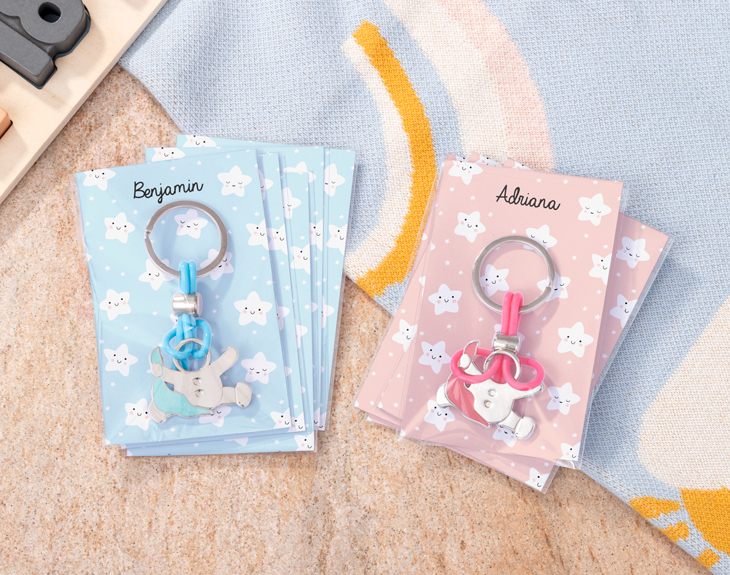 Este llavero personalizado es el detalle perfecto para sacar una sonrisa a los padres que acaban de recibir a su bebé. Si tu familia ha crecido o tienes amigos que han tenido su primer hijo, ¡es el momento ideal para regalar algo tan especial como este llavero! Disponible en dos colores (azul o rosa), puedes personalizar el cartoncito con el nombre del bebé o un mensaje especial. No solo es un regalo ideal para celebraciones de nacimiento, sino también una opción preciosa para los invitados al bautizo de tu hijo o hija. ¡Será un detalle emotivo que hará que todos se sientan parte de ese momento tan único! Personalizar estos originales llaveros es muy fácil. Solo añade el producto al carrito, accede al área de personalización y escribe el texto que desees. Así de sencillo, tendrás un regalo único y lleno de cariño para bautizos o celebraciones familiares.