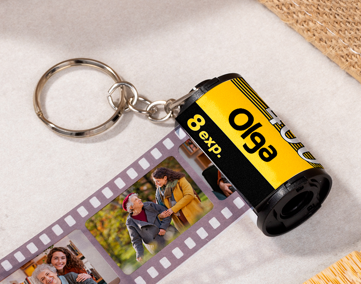 • Llavero de carrete de fotos con tira de 8 imágenes.