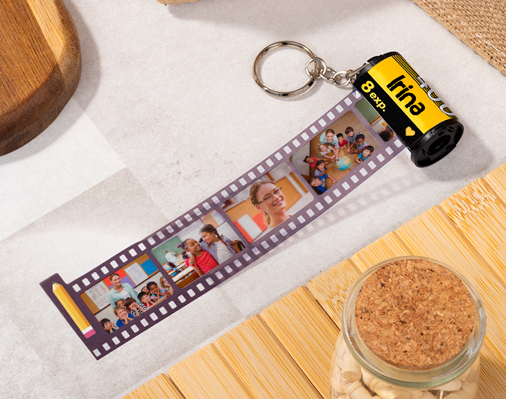Le debemos muchísimas cosas a nuestros profesores. A lo largo de nuestra vida, hemos tenido diferentes experiencias con los maestros que hemos tenido en la escuela, el instituto o la universidad. Puede que no todos hayan sido perfectos, pero algunos lograron hacer mella en nosotros, y plantearnos nuestra existencia de maneras curiosas y muy reflexivas. Puede que el profe de tus hijos sea uno de esos que les ha enseñado y ayudado en todo lo posible, deviviéndose por ellos y con una vocación increíble para los niños. ¿Quieres recompensarle por todos los conocimientos que le ha enseñado a tu pequeño? ¡Tenemos el regalo ideal! El llavero de carrete de fotos personalizado para profes hará que el mejor maestro del mundo se emocione como nunca lo ha hecho. Un curso escolar debe tener momentos inolvidables, y con este carrete de fotos con nombre y ocho imágenes podrás recopilarlos todos en un llavero de lo más retro. Lo único que tendrás que hacer es subir las ocho imágenes que deseas que aparezcan en el carrete. Estas se mostrarán cada vez que ese magnífico profesor tire de la película. Un regalo original para profes que no podrá olvidar jamás. Número de fotos para el carrete: 8. Medidas del carrete: 4,5 cm de alto x 9 cm de ancho circular. Medidas de la tira de fotos: 3,5 x 30 cm. Importante: el orden de las fotos añadidas es aleatorio. Materiales: plástico (cilindro), acetato (tira de fotos). Instrucciones: para desplegar la tira de fotos, hay que tirar firme pero delicadamente el rollo de acetato hacia fuera mientras se sujeta el cilindro. La propia tira se frena automáticamente sin salirse una vez se llega a la última imagen. Para recogerla, recomendamos sujetar firmemente el carrete por los lados y girar hacia dentro con la anilla o con la mano el círculo que sobresale en la parte de arriba; si no, también se puede sujetar el cilindro desde esa parte superior y darle vueltas a toda la superficie.