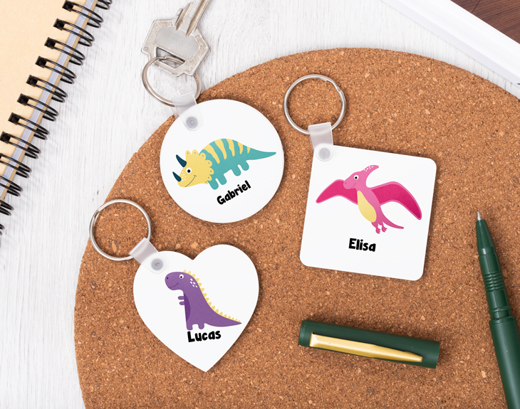 ¡Los dinosaurios están de moda! Y más cuando son tan cuquis y adorables como los de nuestro llavero personalizado Familia Dinosaurios. Podrás escoger el dinosaurio que más te gusta, completar el diseño con un nombre y hasta escoger la forma que tendrá tu precioso llavero. Este llavero es un regalo perfecto para niños y no tan niños. Al hacer el pedido, podrás escoger entre 80 personajes diferentes de todas las especies y colores. ¡Con nuestros tiernos diseños, hasta los tiranosaurios parecen menos temibles! Escoge tu dinosaurio favorito y tendrás un llavero 100% original. A la hora de hacer el pedido, podrás escoger también la forma de tu llavero entre estas tres opciones: - Llavero cuadrado: hecho en madera, con una lámina blanca en la parte superior sobre la que se imprime la imagen. Su tamaño es de 5,5 cm x 5,5 cm. - Llavero circular: hecho en plástico polipropileno. Su tamaño es de 4 centímetros de diámetro. - Llavero con forma de corazón: la mejor opción para parejas románticas. Mide 6,5 cm x 6 cm y está hecho en polipropileno. Importante: máximo de 3 personajes colocados en una única fila.