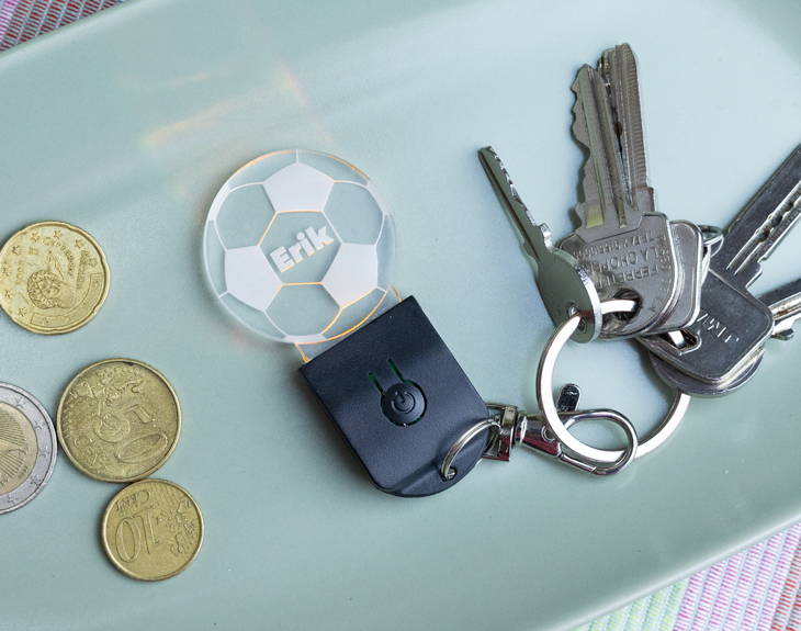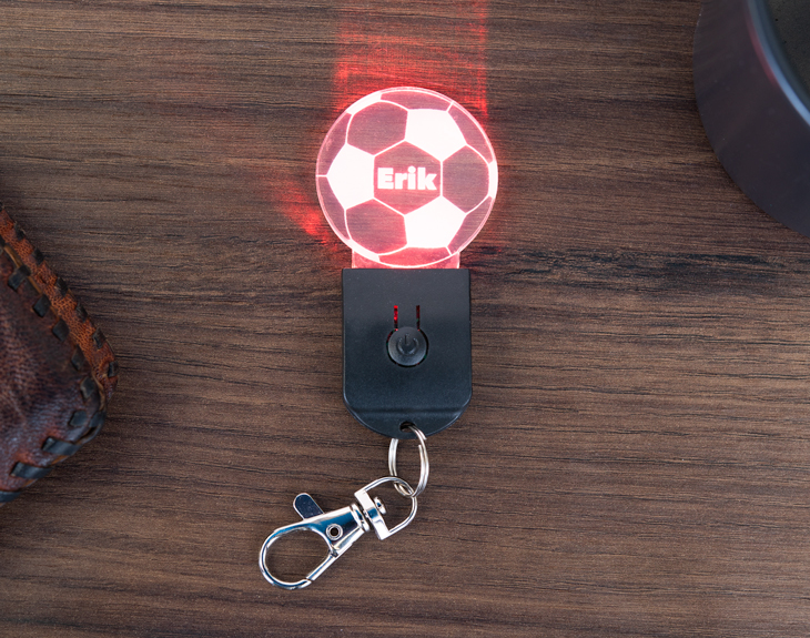 Hay regalos que ya están demasiado explotados, un llavero puede ser uno de ellos, pero este original llavero luminoso es todo un acierto a la hora de regalar. Y sí, has oído bien, es un llavero luminoso. La parte de arriba está fabricada en metacrilato súper resistente y la de abajo en plástico negro. El diseño va en la parte de metacrilato, en este caso es una pelota de fútbol con nombre. ¡El regalo perfecto! Siempre que alguien use sus llaves, se acordará de ti.