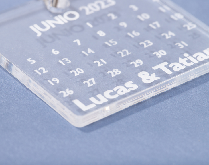 • Llavero rectangular de metacrilato personalizado 5x3,5cm. • Tarjeta Recordatoria.