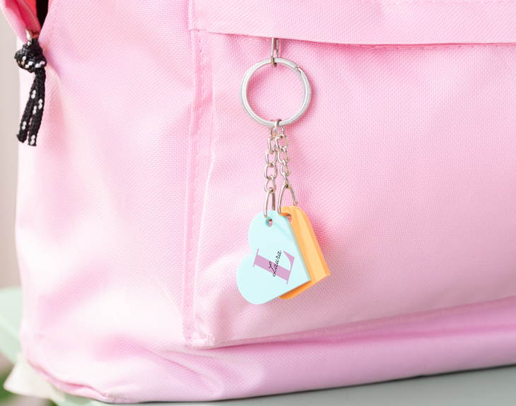 • Llavero personalizado de metacrilato pastel. • Tarjeta Recordatoria.