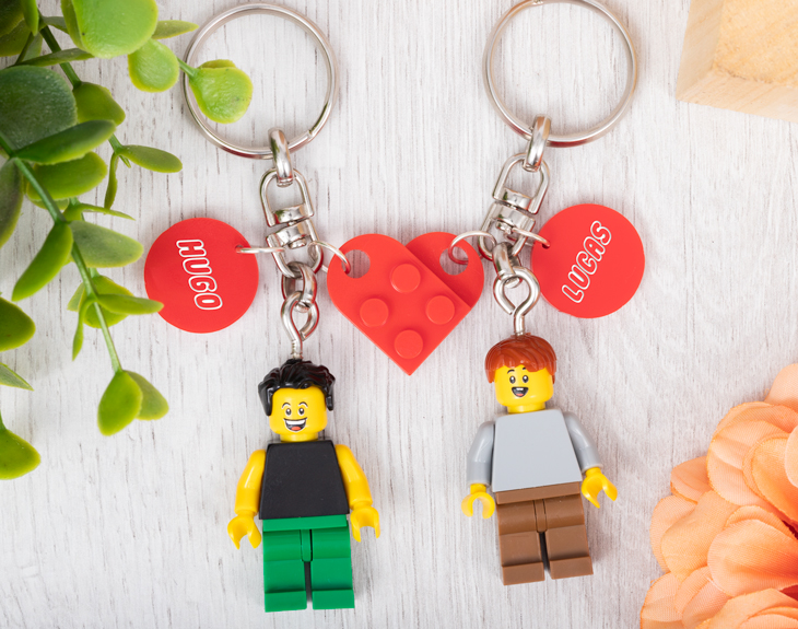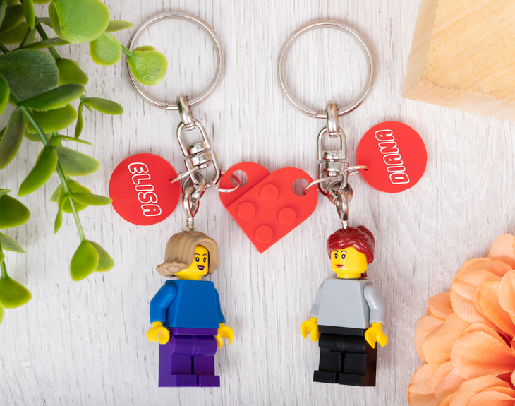 Por fin... ¿Tu pareja y tú habéis dado el gran paso y en unos meses vais a estar viviendo juntos? Si te hace muchísima ilusión y quieres hacerle un regalito, nuestros llaveros Minifigura Pareja Lego será el detalle perfecto. Es una preciosa forma de demostrarle las ganas que tienes de tener vuestra propia casita y convivir, sin duda, le encantará. Si sois súper fans de las piezas de Lego, seguro que alguna vez os habéis preguntado como sería si viviéseis en el mundo lego, pues gracias a este llavero podrás crear a vuestra propia figurita. ¡Es ideal! Así cada uno tendrá bien localizadas sus llaves de casa y no las perderá nunca. Además de las figuritas, este llavero consta de dos piezas de Lego que cuando se unen, forman un corazón, y vienen con una pequeña chapita en la que podrás poner vuestros nombres. Ya sea para el día de los enamorados, para sorprender a tu pareja, a cualquier familiar o amigo creemos que este regalo es ideal. Por último, para diseñar a estas minifiguras, lo primero es añadir el producto al carrito y entrar al área de personalización. Una vez ahí, ya puedes elegir las características de tu figura Lego y nosotros nos encargamos de montar las piezas para crear a una pareja de Legos igualitos a vosotros. Pronto estarán perfectos y listos para regalar. ¡Será un original regalo para fans de Lego! Color del corazón de Lego: rojo. En el caso de que una pieza no esté disponible, se sustituirá por otra similar.