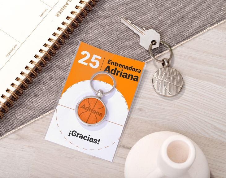 El baloncesto es el deporte favorito de muchos, y quienes lo viven con pasión lo disfrutan todo el año. Si se acerca el final de temporada, tenemos el detalle perfecto para esos entrenadores que lo han dado todo por su equipo. Este llavero con forma de pelota de baloncesto es un regalo original y lleno de significado para quienes sienten este deporte de verdad. Es un regalo práctico y útil, ideal para que el profe o entrenador tenga siempre sus llaves localizadas. Además, incluye un cartoncito personalizado, donde podrás añadir su nombre, el número de camiseta, el nombre del equipo o un mensaje especial de agradecimiento. ¡El resultado será un llavero personalizado para entrenadores único y muy especial! ¿Cómo personalizarlo? Muy fácil: añade el producto al carrito y accede a nuestro diseñador. Allí podrás personalizar tanto el llavero como el cartoncito con el texto que desees. ¡Y listo! Nosotros nos encargamos del montaje para que tengas un regalo original para entrenadores que nunca olvidarán.