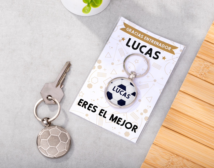 ¿Buscas un detalle especial para ese entrenador que lo ha dado todo durante la temporada? Este llavero con forma de balón de fútbol es el regalo perfecto para agradecerle su esfuerzo, su pasión y su dedicación al equipo. Un detalle práctico que podrá llevar siempre consigo, acompañado de un cartoncito personalizado donde puedes añadir su nombre, el nombre del equipo o un mensaje de agradecimiento. ¡Un recuerdo que seguro le sacará una sonrisa! Este llavero personalizado para entrenadores es ideal para cerrar la temporada con un gesto original y lleno de emoción. Porque no hay mejor forma de decir “gracias” que con un regalo pensado al detalle. ¿Cómo personalizarlo? Muy fácil: añade el producto al carrito y accede a nuestro diseñador. Allí podrás personalizar tanto el llavero como el cartoncito con el texto que desees. ¡Y listo! Será un regalo original para entrenadores.