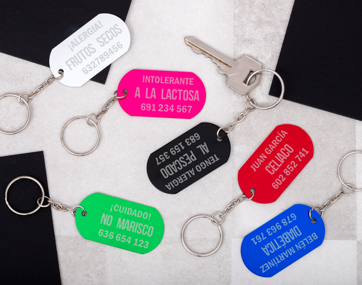Hoy en día no es nada raro ser alérgico o intolerante a alguna cosa. Lo importante de ello es cuidarse y hacer párticipe de ello a la gente para que sepan cómo actuar si pasa algo. Por eso, es importante que lleves siempre encima este llavero personalizado donde se indica a qué eres alérgico o intolerante. A partir de ahora cuando salgas de casa, tendrás que llevar siempre encima este original llavero. Además de elegir el color que más te guste para la plaquita, podrás añadir el texto que quieras, para indicar lo que quieras. ¡Será el llavero más útil del mundo! Para personalizar este llavero lo único que tienes que hacer es añadir el producto al carrito y entrar en el área de personalización. Una vez dentro, podrás elegir el color del llavero y después escribir lo que quieras. Nosotros nos encargamos de que quede perfecto y lo recibas directamente en casa.