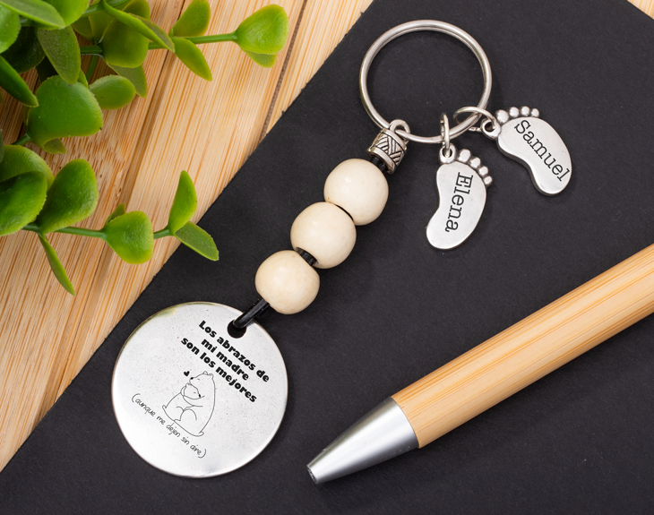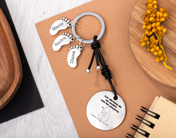 Los abrazos son la mejor cosa del mundo. Los mejores son esos que te dejan sin aire. Si tu mamá da los mejores abrazos que te curan todos los males, tenemos el mejor regalo que le puedes hacer. Se trata de nuestro llavero con huellitas personalizados con diseño "Los abrazos de mi madre" será el detalle perfecto. Este llavero es genial para que nunca pierda las llaves de casa ni pierda tiempo buscándolas dentro del bolso. ¡Las encontrará a la primera! Y lo mejor de este llavero es que es personalizable. Podrás escribir los nombres de todos sus seres queridos. ¡ASí siempre os llevará con ella! Es ideal para sorprenderla por el Día de la Madre o por su cumpleaños. ¡Le encantará! Por último, personalizar este llavero es súper sencillo. El primer paso a seguir consiste en añadir el producto al carrito y entrar al área de personalización. Una vez ahí, ya puedes escribir los nombres que tú quieras y nosotros nos encargamos de grabarlos en este llavero. Pronto estará perfecto y listo para regalar. ¡Será un original regalo para madres! Medida de largo con la medalla: 8 cm aproximadamente. Medida diámetro medalla: 3,3 cm aproximadamente