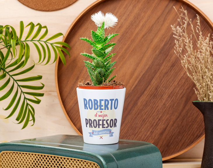 Con la de horas que se va a pasar tu profesor dando clases o corrigiendo exámenes, seguro que agradece tener algo de compañía fija. ¡Y sin que le dé ningún ruido! Una planta siempre es una gran compañera, y qué mejor sitio para tenerla que esta maceta personalizada. Cualquier maceta pequeña quedará aún más bonita sobre este recipiente. ¡Dedicado exclusivamente a ese gran maestro! Para que sea un fantástico regalo original para profesores, podrás escribir su nombre en lo alto. ¡Que presuma en el aula de ser el mejor del mundo! Te lo ponemos incluso más fácil: no pienses qué planta o maceta incluir y llévate por muy poco más este pack de maceta y cactus. ¡Con opción doble a precio reducido! Importante: El tipo de cactus puede variar según stock.