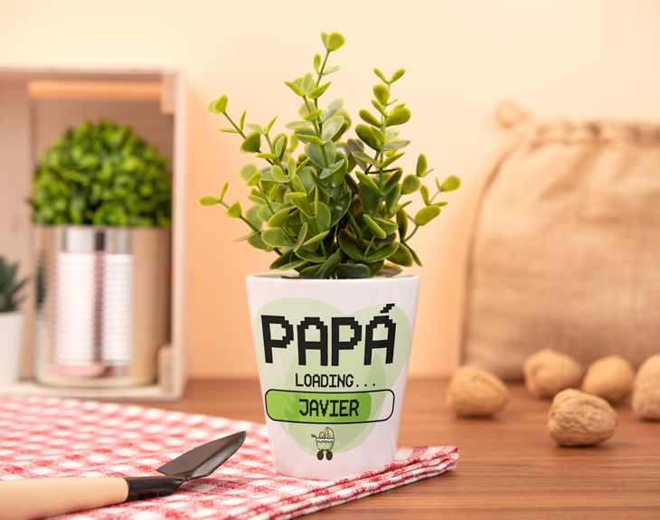 Si tienes un amigo que va a ser papá, ¡seguro que están expectante como nervioso! Cuidar de una nueva vida es una gran responsabilidad pero también un enorme privilegio. Ayúdale a habituarse a esta tarea a un nivel más básico con esta maceta personalizada. Así podrá plantar cualquier planta que quiera e irá cogiendo la rutina de los cuidados. Además de ser un regalo original y útil, también está especialmente pensado para esos meses de embarazo previos al parto. ¡Son unas semanas de mucha expectación! Seguro que le encantará recordar cada día que su hijo/a ya está en camino. Para ello, podrás escribir el nombre de su futuro bebé sobre la maceta en este diseño gamer para los padres más frikis. Si no sabes qué planta aconsejarle, ¡también te lo damos hecho! Puedes escoger el pack de maceta y cactus para que ya lo tenga todo. Importante: el cactus puede incluir flor o no según stock.