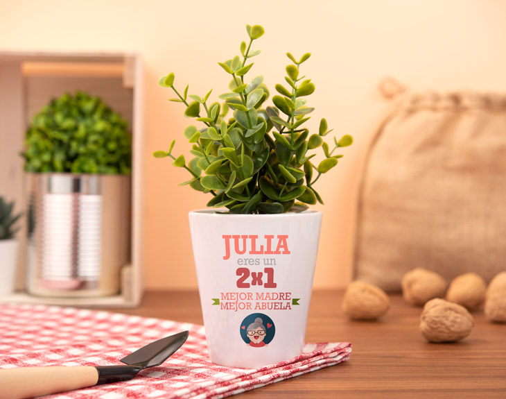 ¿Te apetece darle una sorpresa original a tu madre? ¿Quieres recordarle lo buena madre y abuela que es? ¿Viene el día de la madre, su cumpleaños o simplemente quieres darle alguna sorpresa? Esta maceta personalizada es el regalo ideal. Este regalo es un bonito detalle para que recuerde constantemente lo mucho que la quieres. Para personalizar la maceta lo único que tenéis que hacer es escribir el texto que queráis que vaya arriba: su nombre, una fecha y nosotros nos encargaremos del resto. Importante: el cactus puede incluir flor o no según stock.
