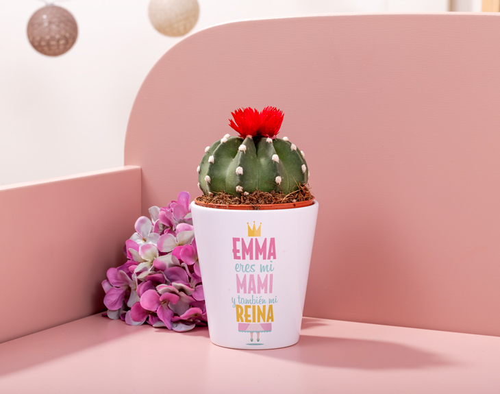 Si tu madre es la reina de la casa y quieres recordárselo qué mejor manera de hacerlo que esta preciosa maceta personalizada. Todos los días que la mire recordará tu amor incondicional por ella y lo mucho que le aprecias. Si quieres esta maceta personalizada lo único que tienes que hacer es darnos el nombre que quieres que vaya encima y nosotros haremos el resto. Importante: el cactus puede incluir flor o no según stock.